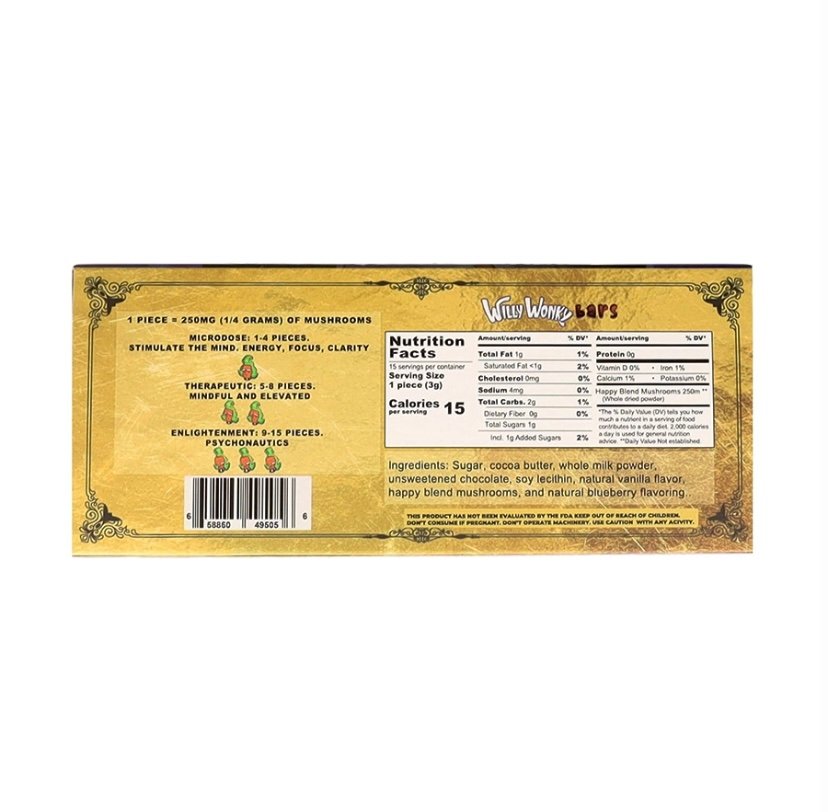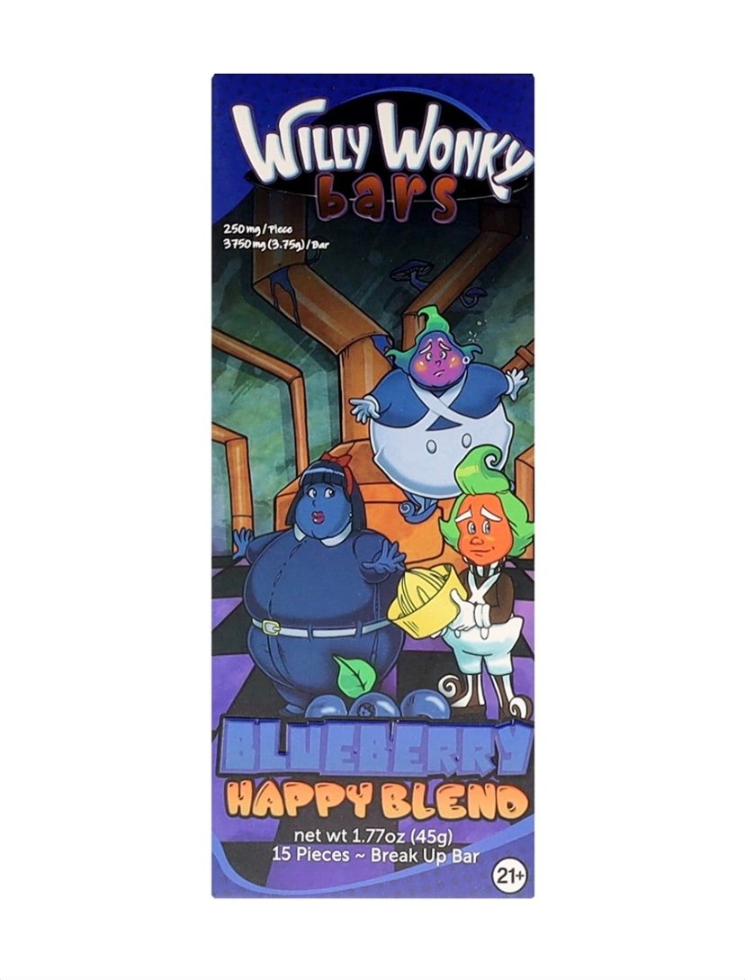 BRAND Willy Wonky Bars PRODUCT TYPE Edibles, Mushroom Chocolate STRENGTH 3750mg AMOUNT PER SERVING 250mg PIECES PER BAR 15 STRAIN Blueberry