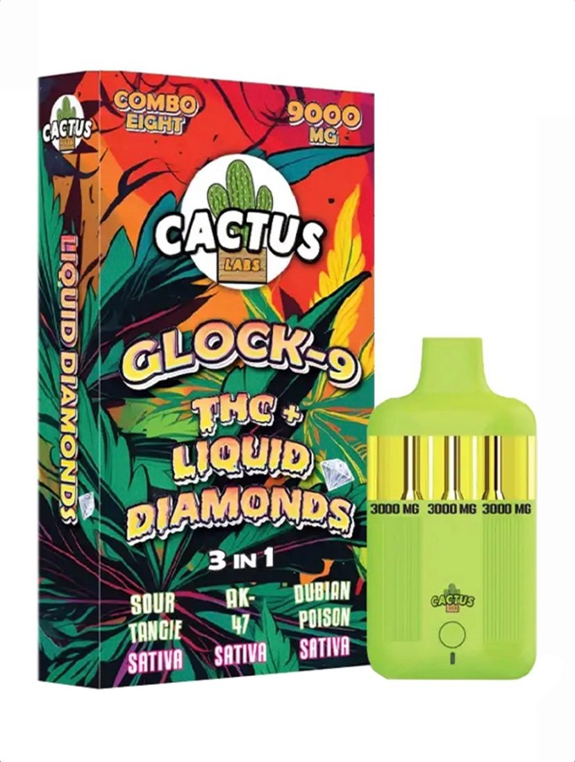 Immerse yourself in the enticing array of flavors and effects with the Cactus Labs Glock 9 THC + Liquid Diamonds 3in1 Vape 9000mg, a premium and versatile vaping solution designed for those who appreciate variety and potency in their cannabis experience.